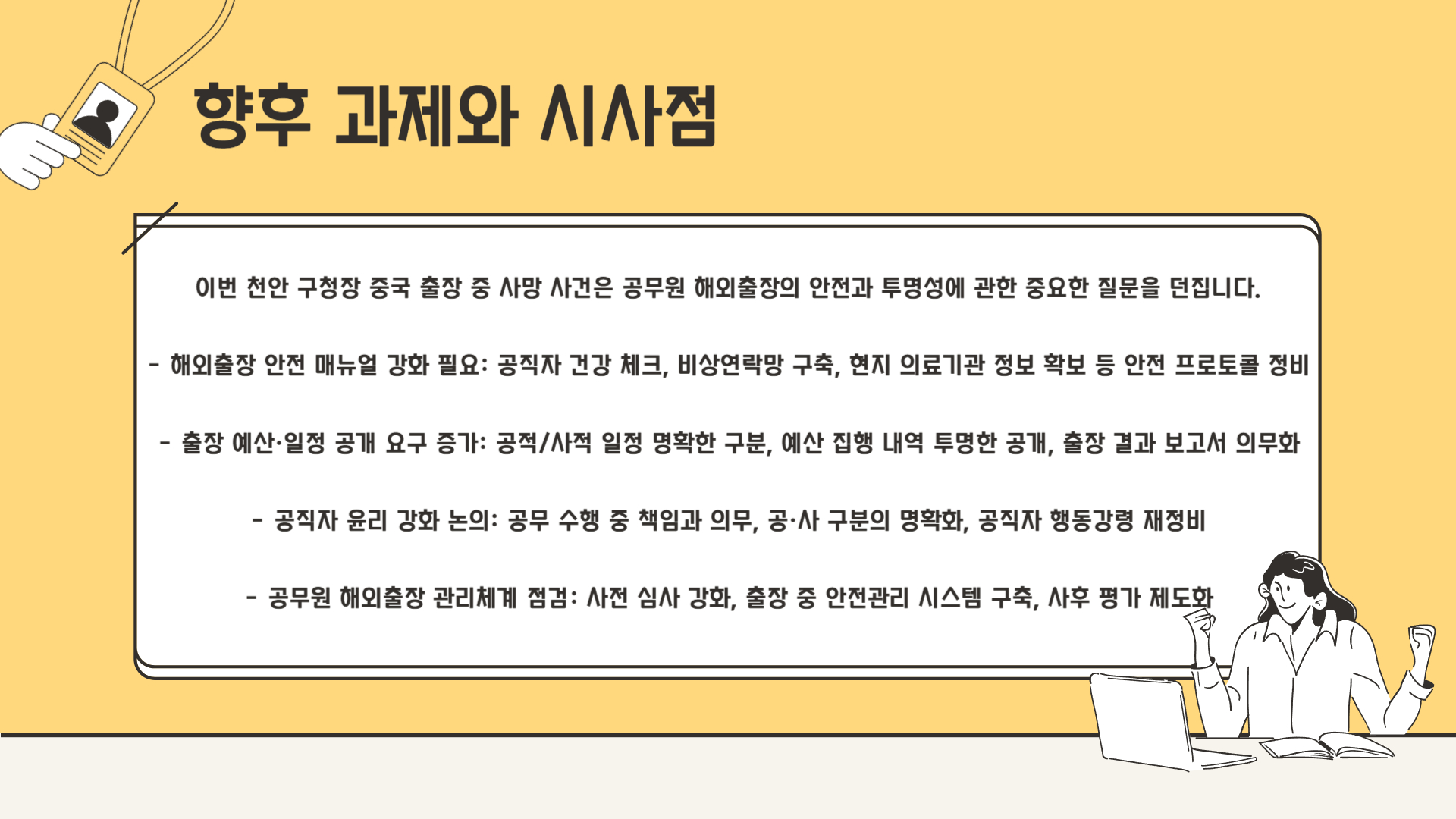 이 사건은 단순한 개인의 사고사로 끝날까요? 아니면 “공무원 해외출장의 관리·투명성 문제”로 이어질까요?